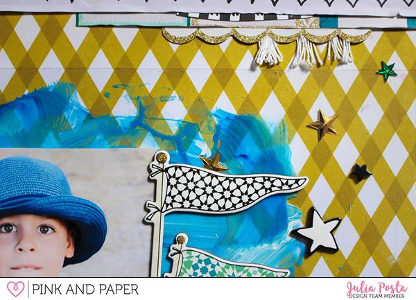 To balance my page I added some black and white strips on the top of my layout. As a final touch, for a little eye catching detail I have used almost all of the stars from Carousel collection.